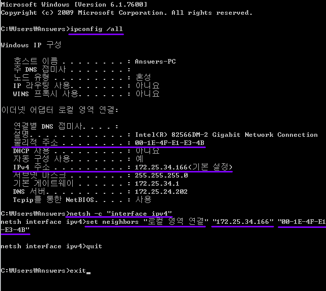 netsh interface ipv4>set neighbors "로컬 영역 연결" "172.25.34.166" "00-1E-4F-E1-E3-4B"