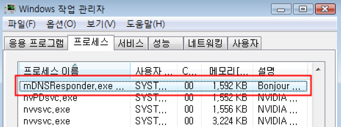 그림과 같이 mDNSResponder.exe 항목을 강제종료합니다