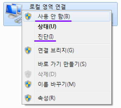 5) [로컬 영역 연결] 항목에 마우스우측 클릭합니다